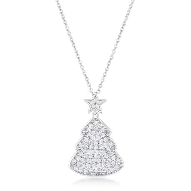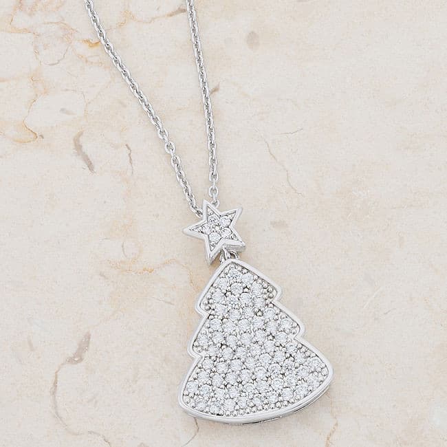 Clear finely cut stones saturate the face of a festive 5.75 carat christmas tree inspired necklace. The perfect accompaniment to your holiday ensemble. Our genuine rhodium finish is achieved using an electroplating process that coats the item with heavy layers of rhodium a close cousin to platinum. This gives our jewelry a platinum luster.