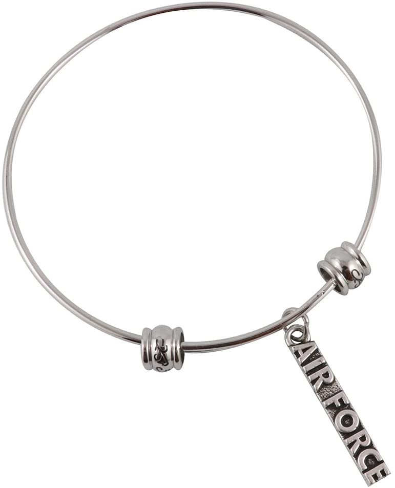 This Air Force charm bracelet is perfect for the Air Force lover. A great gift for a service person or someone who just loves the Air Force. This adjustable stainless steel bangle has beautiful scrolled wrist protectors. Fashionable for any occasion and can be worn with any outfit or suit. Ready to be ordered and shipped to you by Amazon.