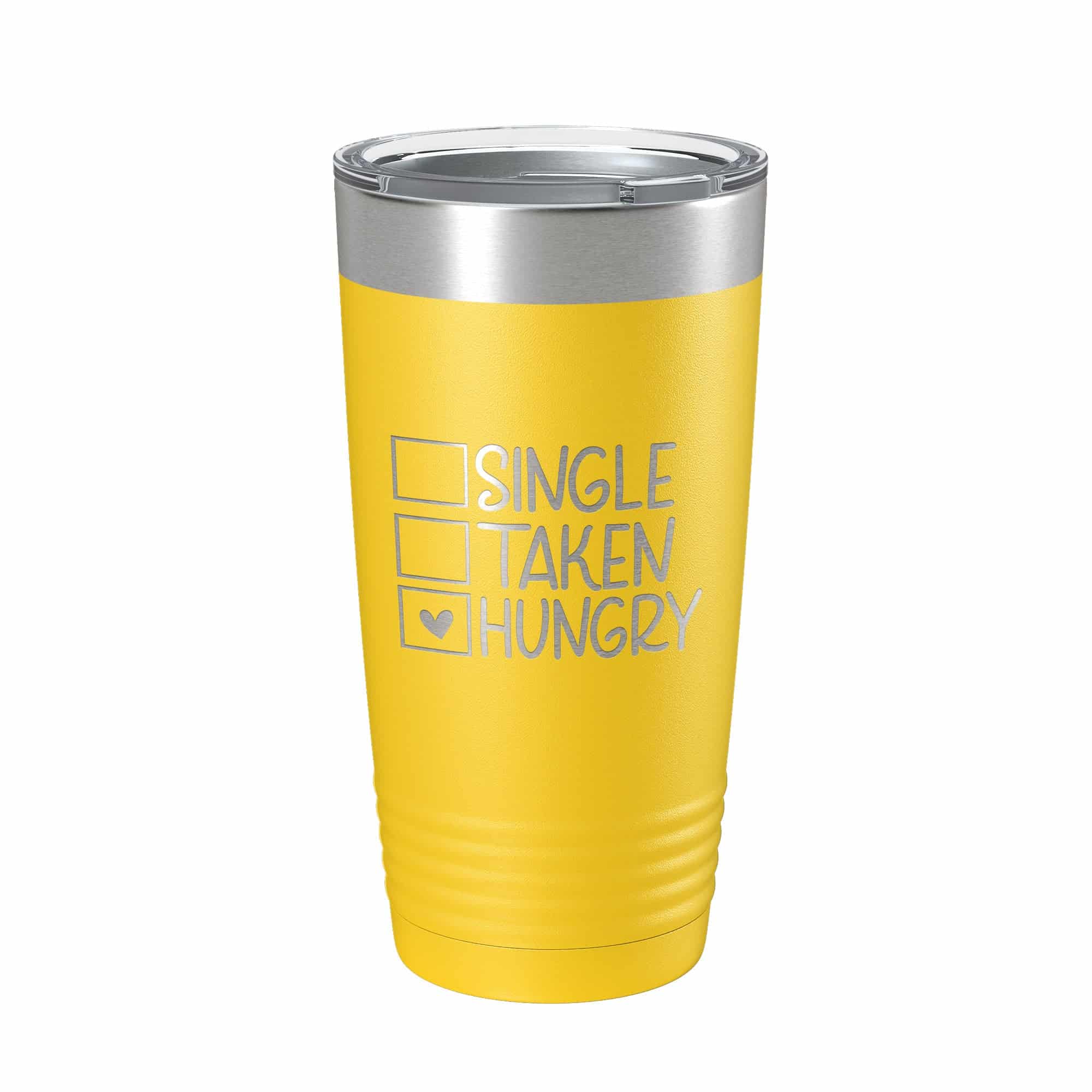Single taken hungry tumbler is made from 304 stainless steel and the design is permanently laser etched into the powder coat. The design will not peel or fade unlike vinyl decals and stickers. Clear lid is included and the hole on the lid is big enough for a straw. Double-wall vacuum insulation means the cup will not sweat and it keeps drinks hot or cold for hours. Mug has a narrower bottom to fit most standard cupholders. Ridges provide a secure grip. Cup measures 6.76″ tall x 3.46″ wide at top. Holds 20 fluid ounces or 591 mL. Hand wash only. 100% BPA free. Unique gift idea for birthdays, anniversaries, housewarming, Christmas, Mother’s Day, Father’s Day, bachelor/bachelorette parties, real estate clients, etc. Each bottle comes individually boxed for easy gifting and convenient packaging.