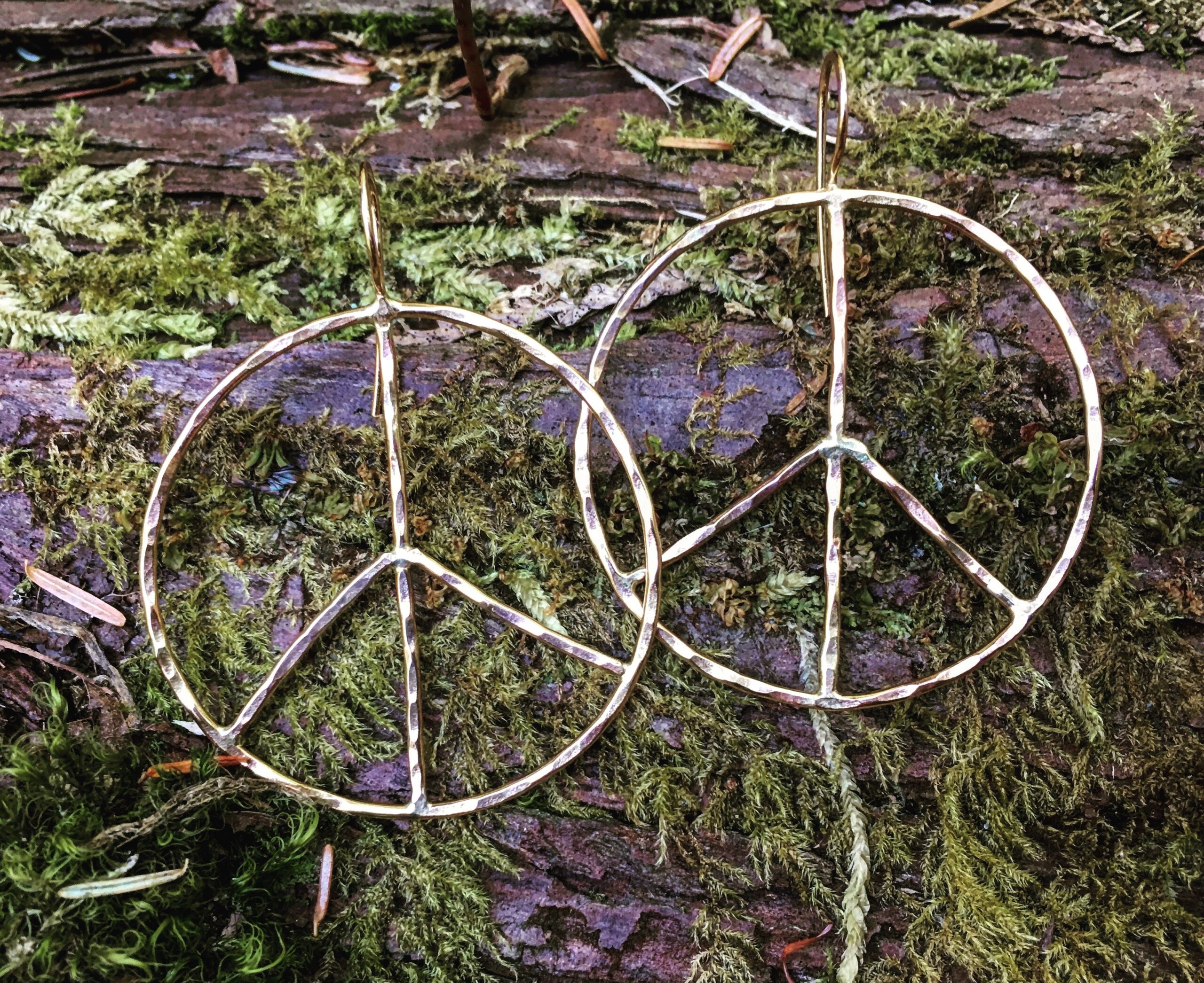 These gorgeous rustic, peace sign earrings are hand fabricated and hand formed, so each pair with vary slightly. They are a part of The Emergi Collection: ‘Emergi’ – to rise up, emerge, free one’s self. Adornment for those extra special moments in life, designed to celebrate life, love, and joy. Made of lightly hammered 16g wire these peace earrings are the perfect accessory for any outfit. Shiny, hammered texture create an organic, rustic feel. These hoops measure 1 5/8 inch.