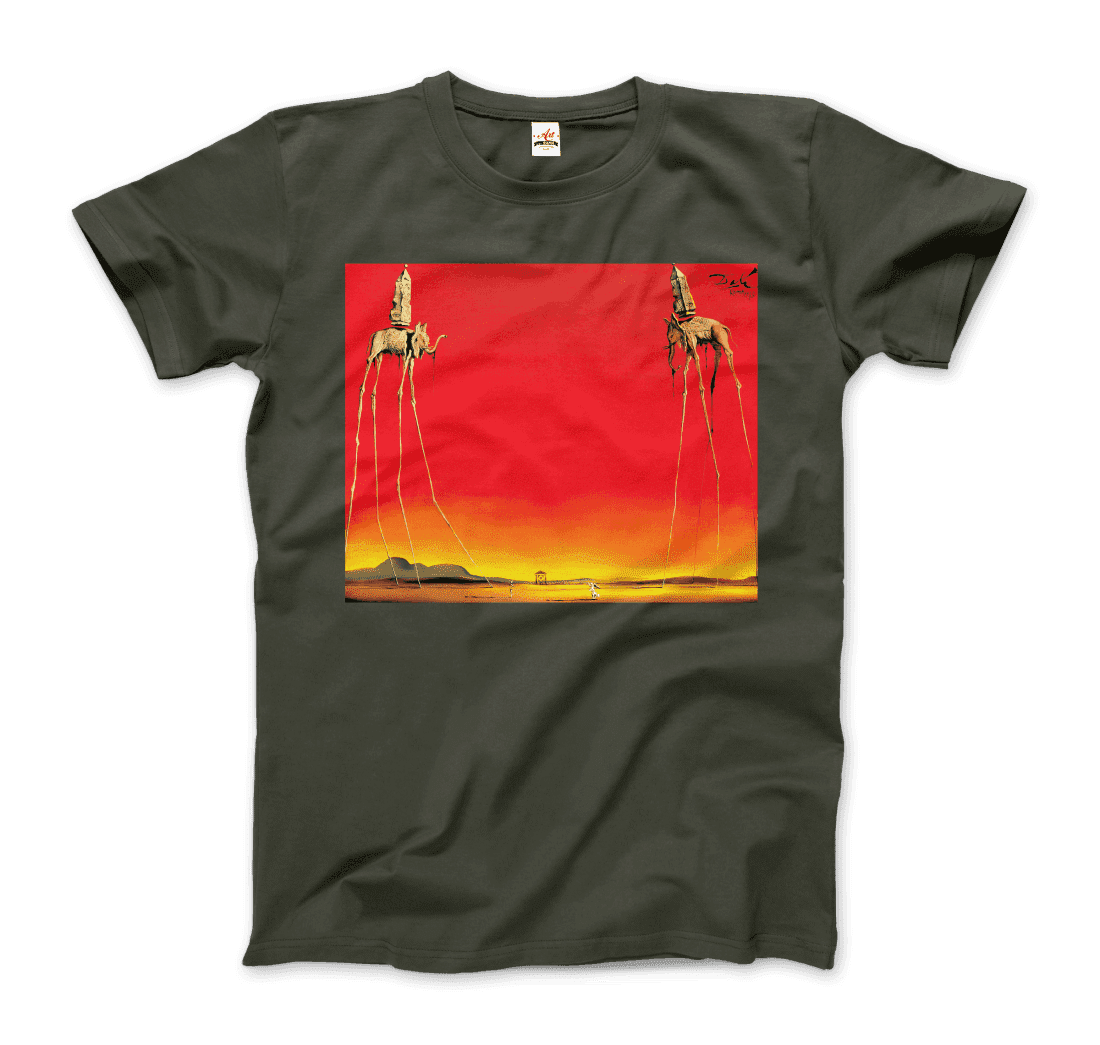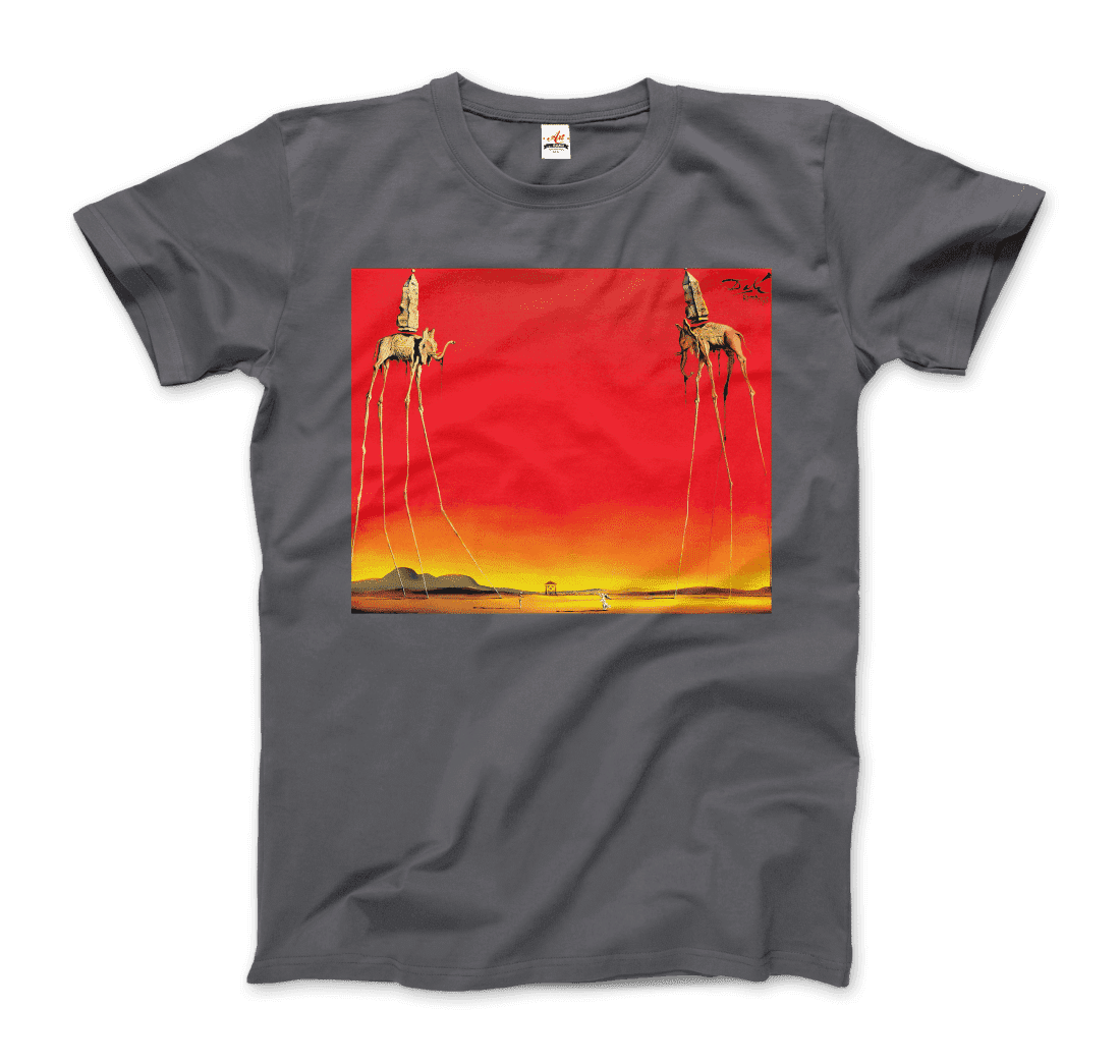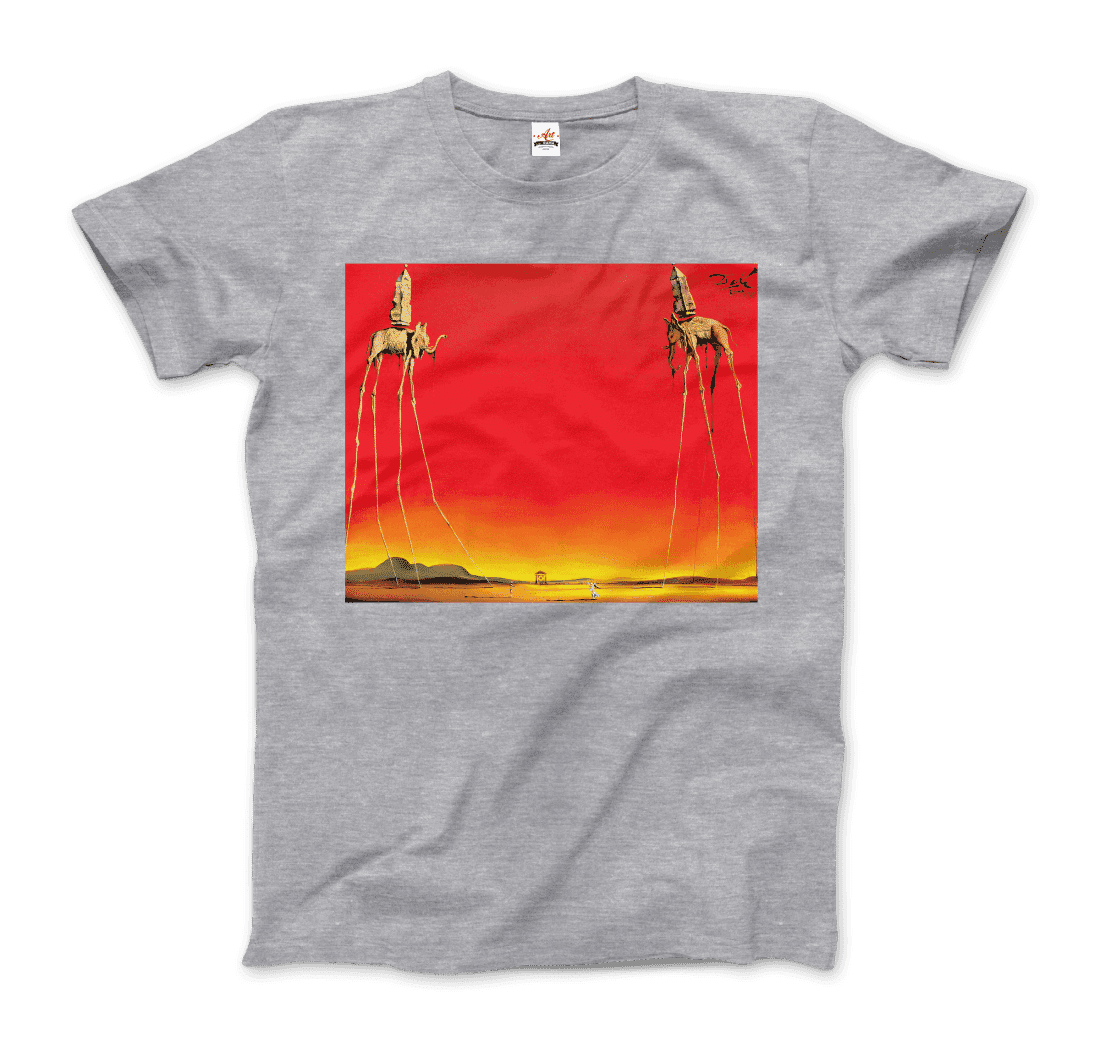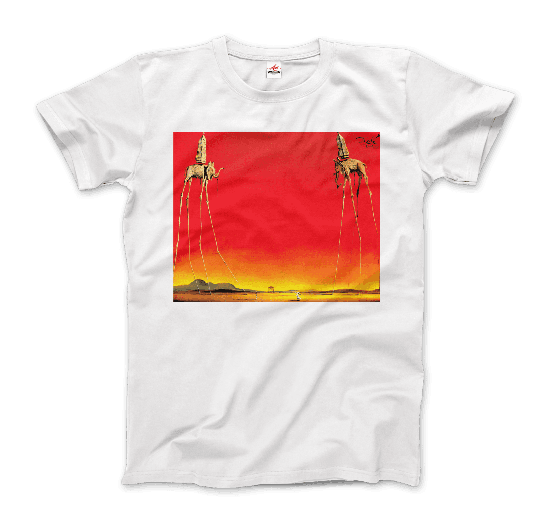 This amazing tee features a recurring theme in the works of Dalí. The Elephants differs from the other paintings in that the animals are the primary focus of the work, with a barren graduated background and lack of other content, whereas most of Dalí’s paintings contain much detail and points of interest. There are various cultural depictions of elephants, where they are often viewed as symbols of strength, dominance, and power due to their bulk and weight. Dalí contrasts these typical associations by giving the elephants long, spindly, almost arachnid-like legs, once described as “multijointed, almost invisible legs of desire”.