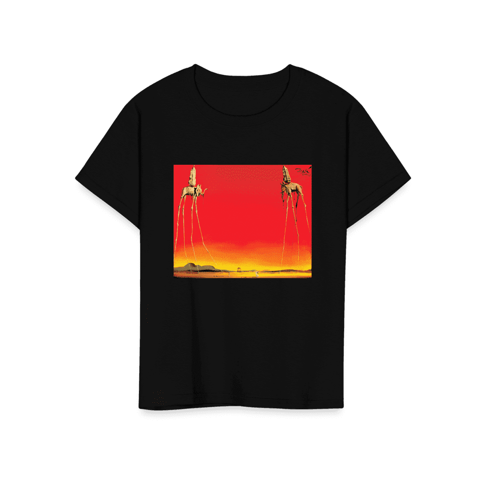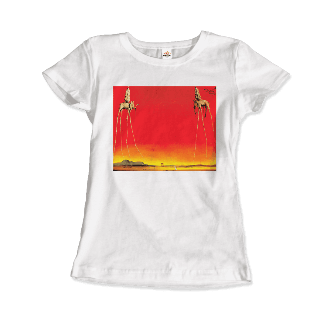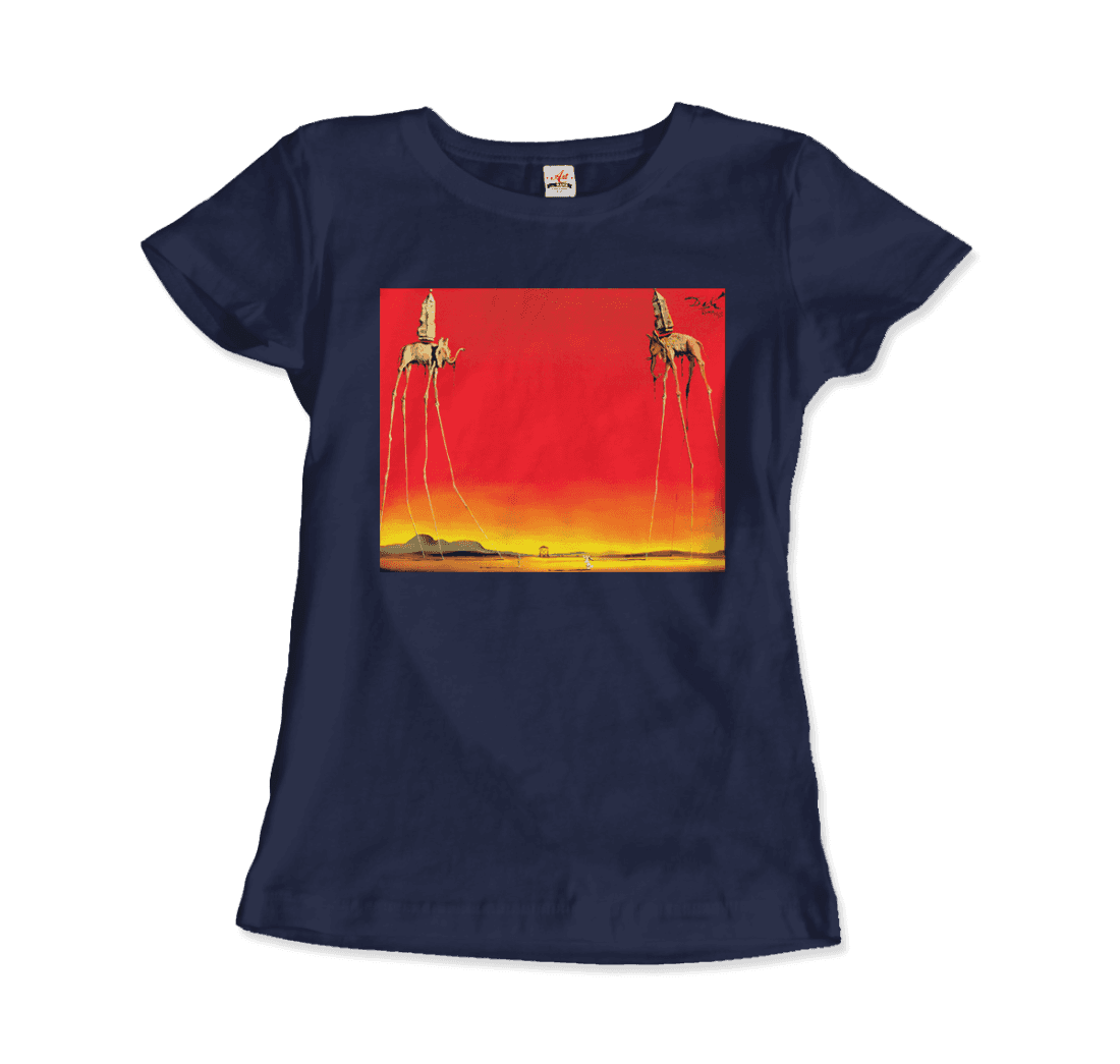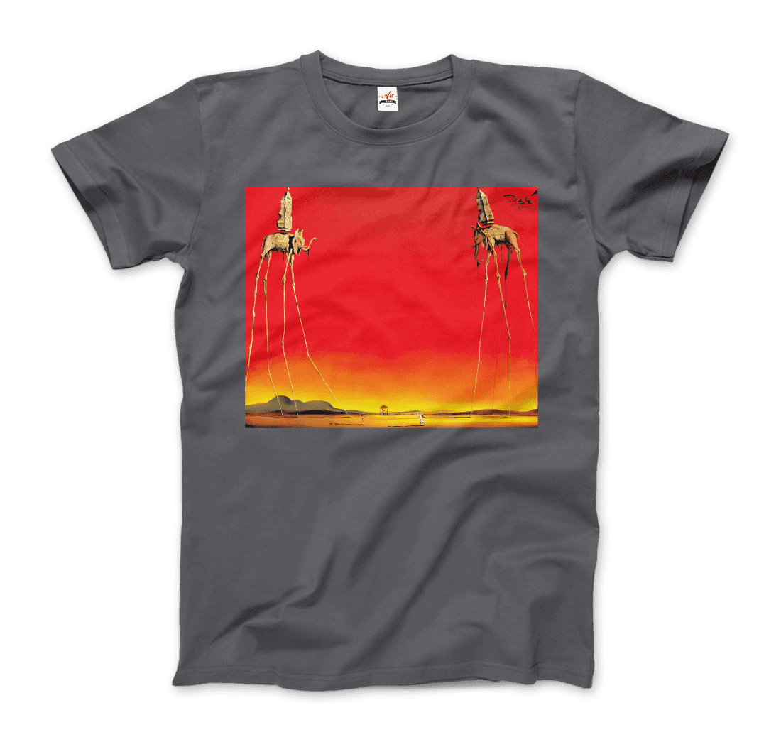 This amazing tee features a recurring theme in the works of Dalí. The Elephants differs from the other paintings in that the animals are the primary focus of the work, with a barren graduated background and lack of other content, whereas most of Dalí’s paintings contain much detail and points of interest. There are various cultural depictions of elephants, where they are often viewed as symbols of strength, dominance, and power due to their bulk and weight. Dalí contrasts these typical associations by giving the elephants long, spindly, almost arachnid-like legs, once described as “multijointed, almost invisible legs of desire”.