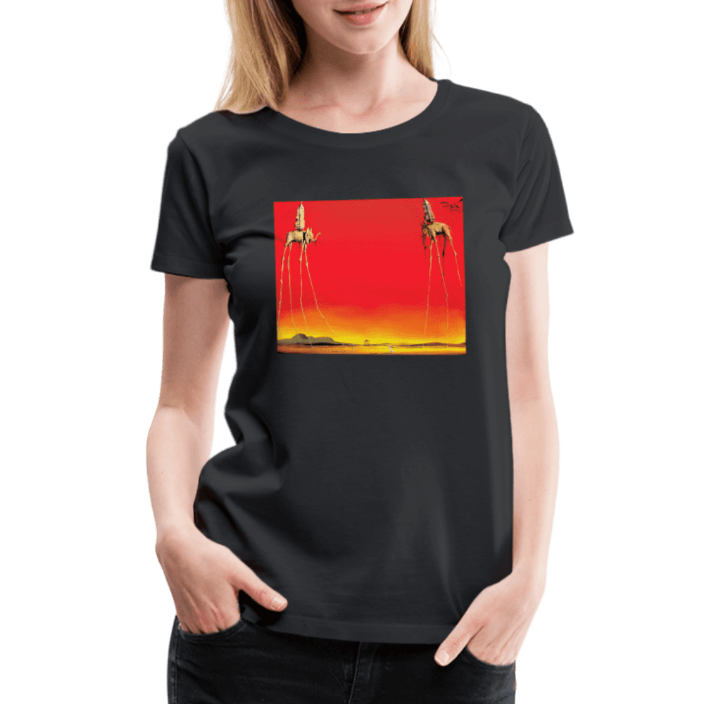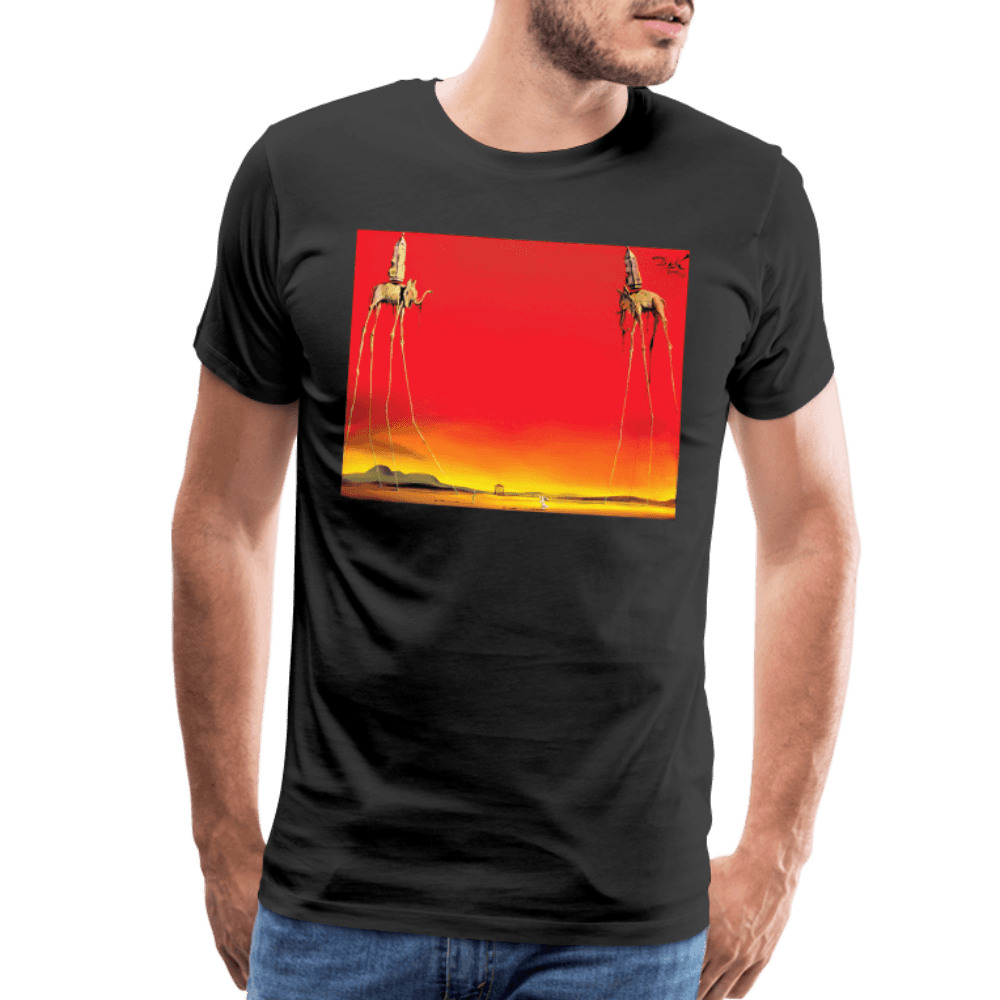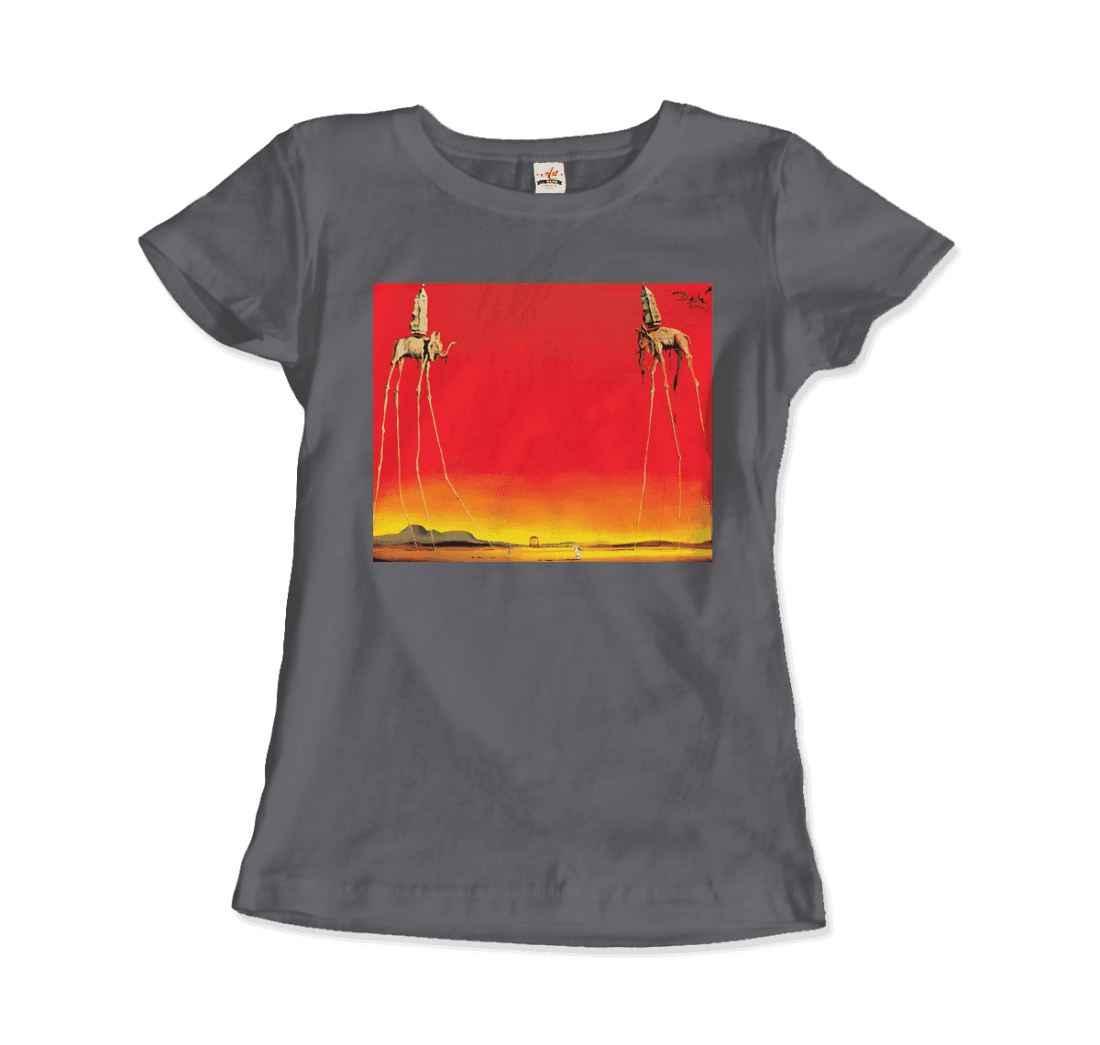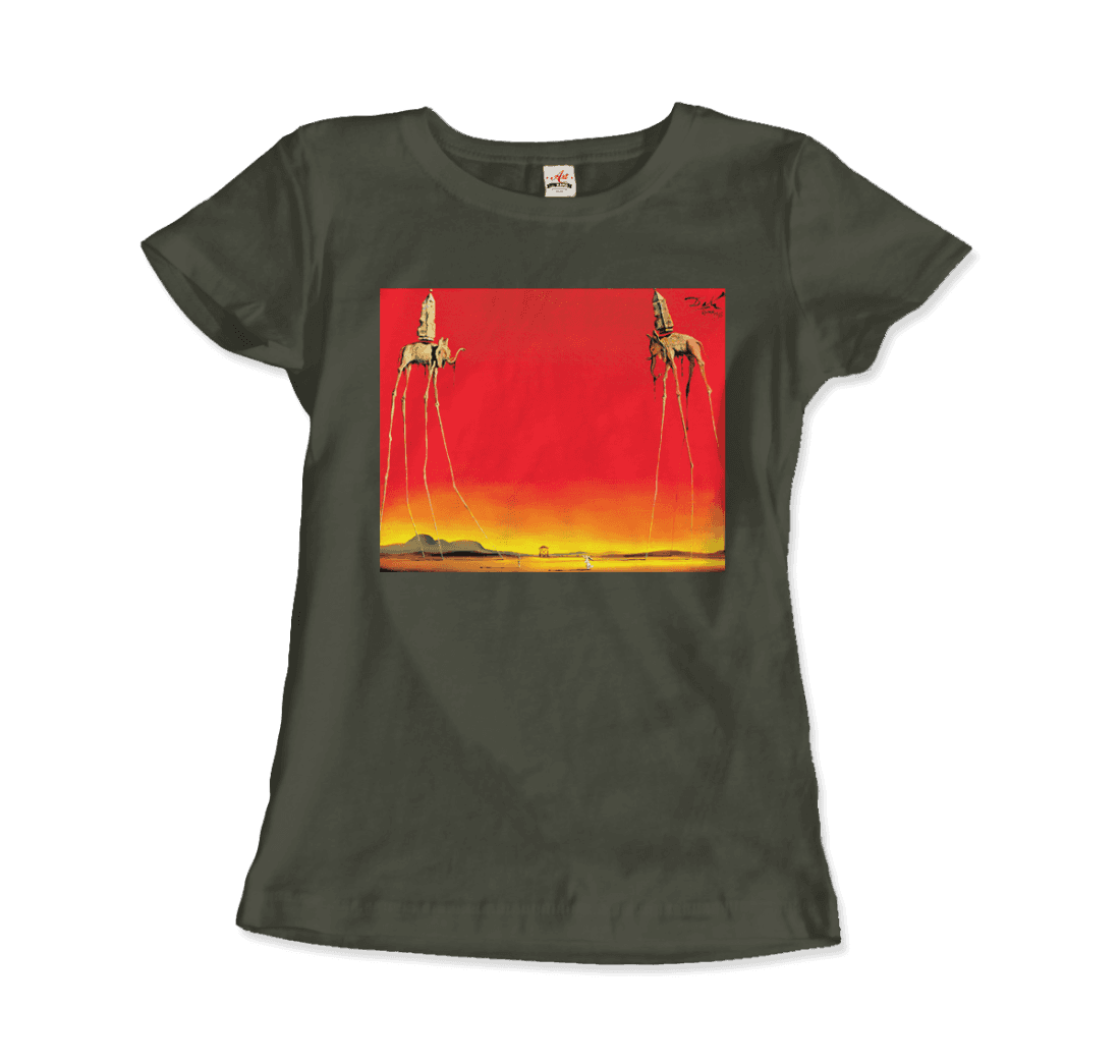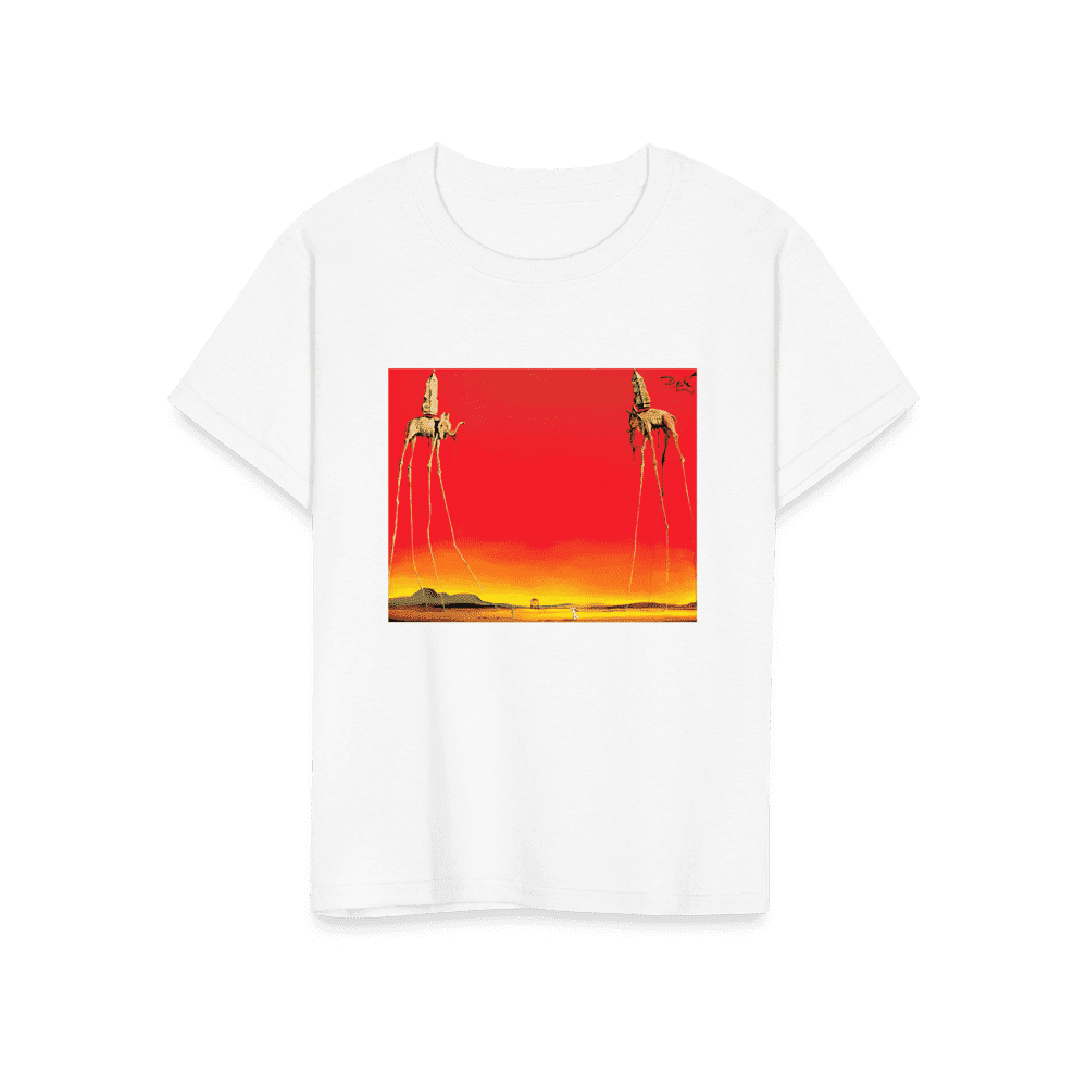 This amazing tee features a recurring theme in the works of Dalí. The Elephants differs from the other paintings in that the animals are the primary focus of the work, with a barren graduated background and lack of other content, whereas most of Dalí’s paintings contain much detail and points of interest. There are various cultural depictions of elephants, where they are often viewed as symbols of strength, dominance, and power due to their bulk and weight. Dalí contrasts these typical associations by giving the elephants long, spindly, almost arachnid-like legs, once described as “multijointed, almost invisible legs of desire”.