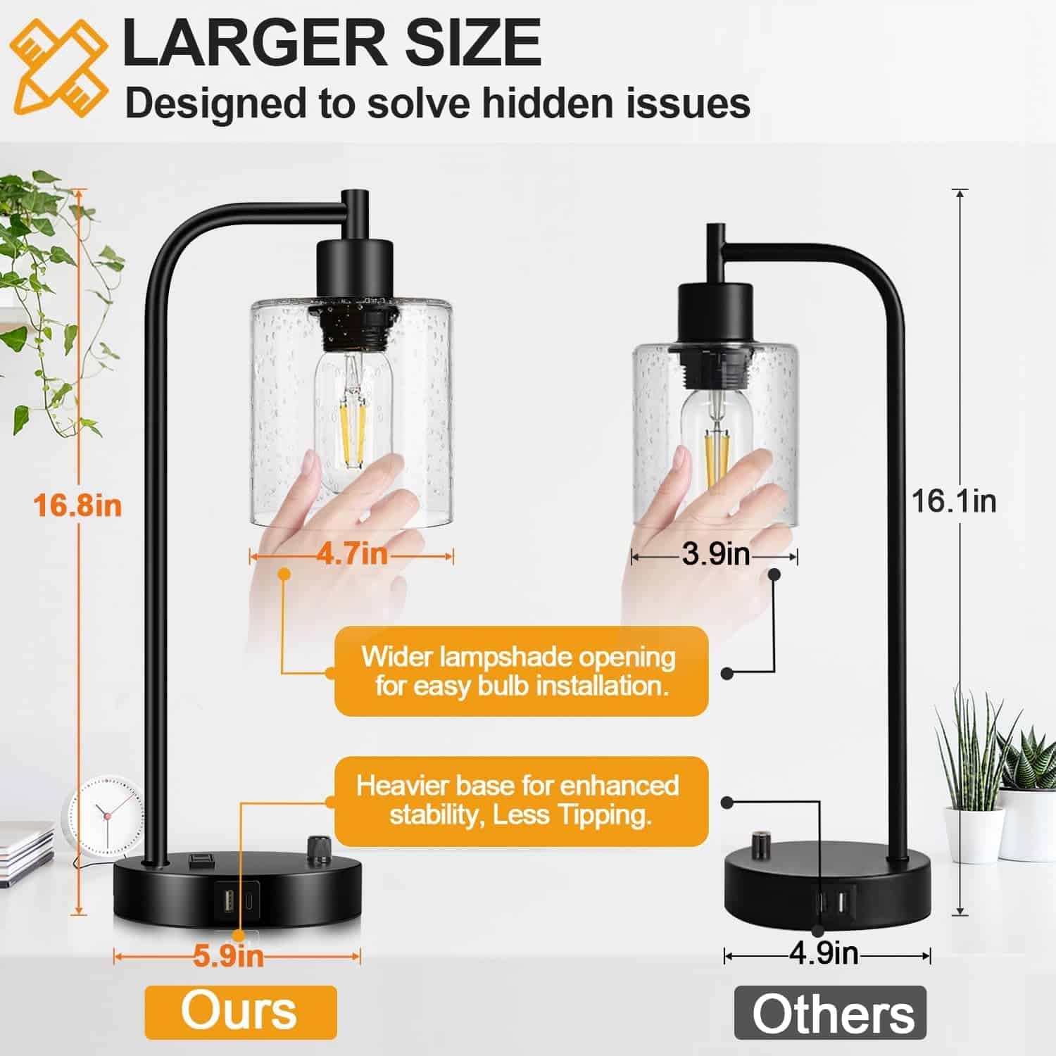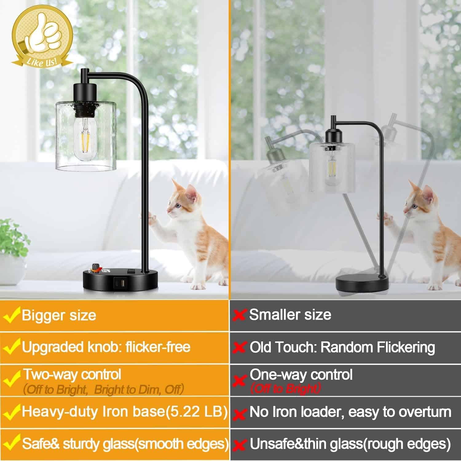 Illuminate your space with industrial charm and built‑in USB charging. This set of two lamps blends rugged metal with a seeded glass shade to deliver warm, inviting light while keeping your devices powered up—perfect for bedrooms, desks, and living areas.